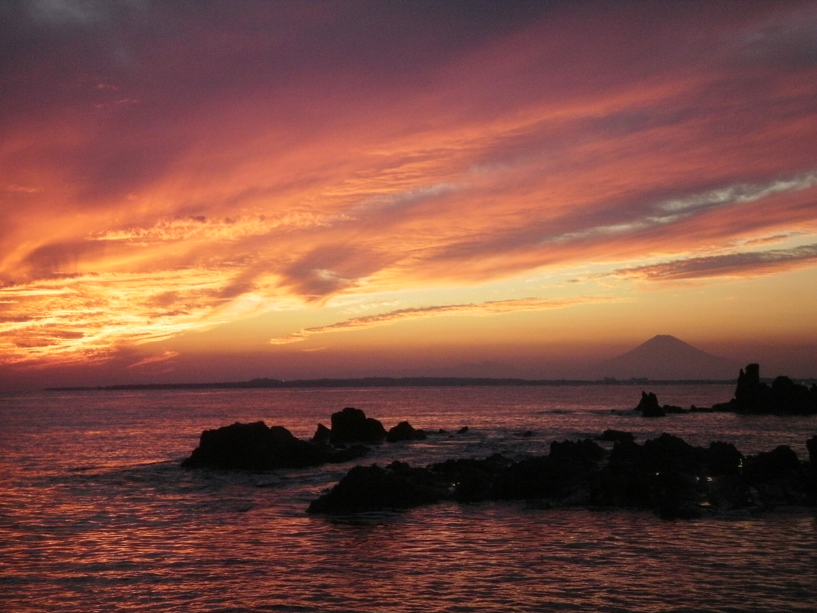 夕日がオレンジ色になり、富士山のシルエットを強くします。