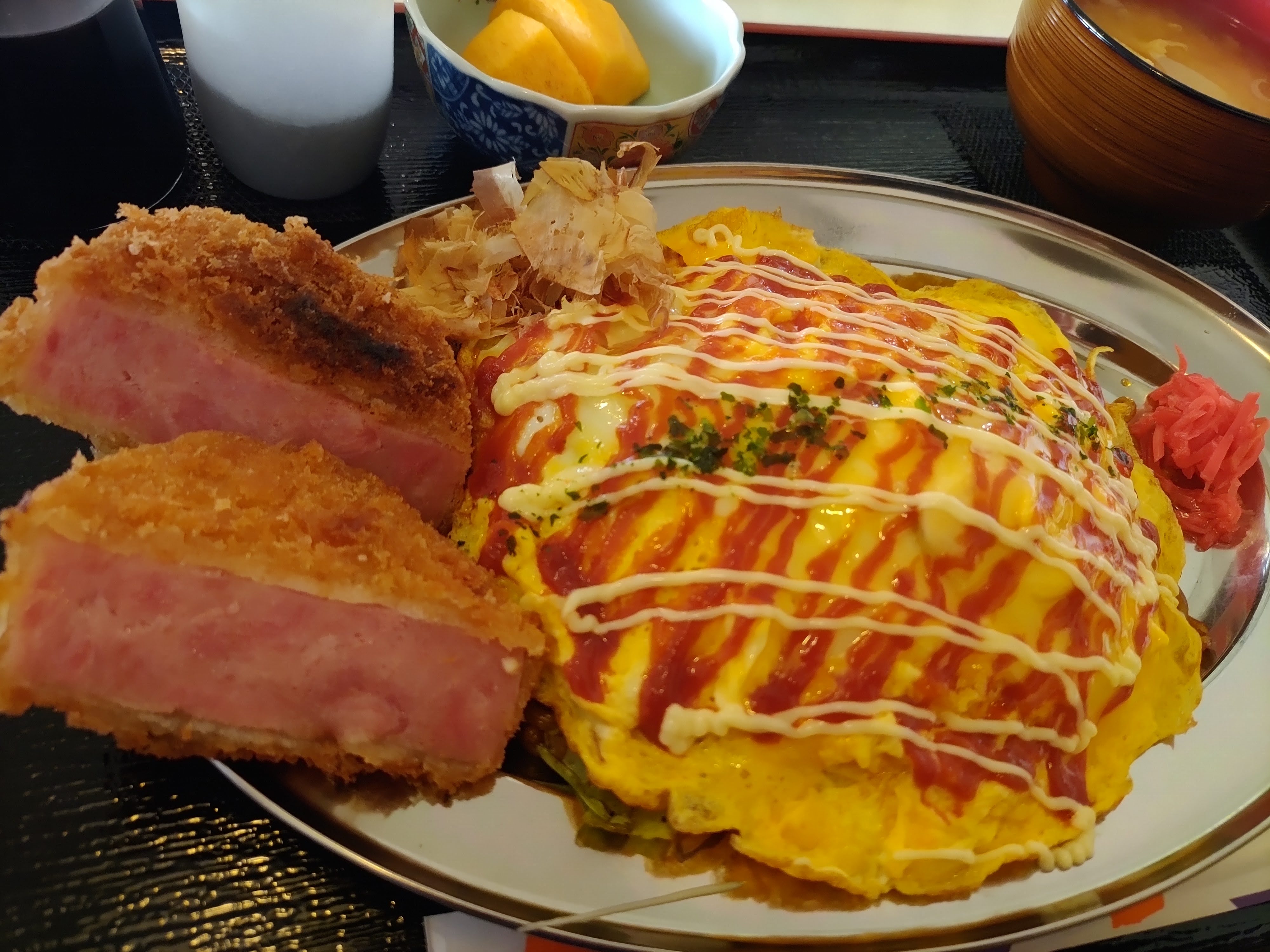 分厚いハムカツでお腹がいっぱいだ。 |