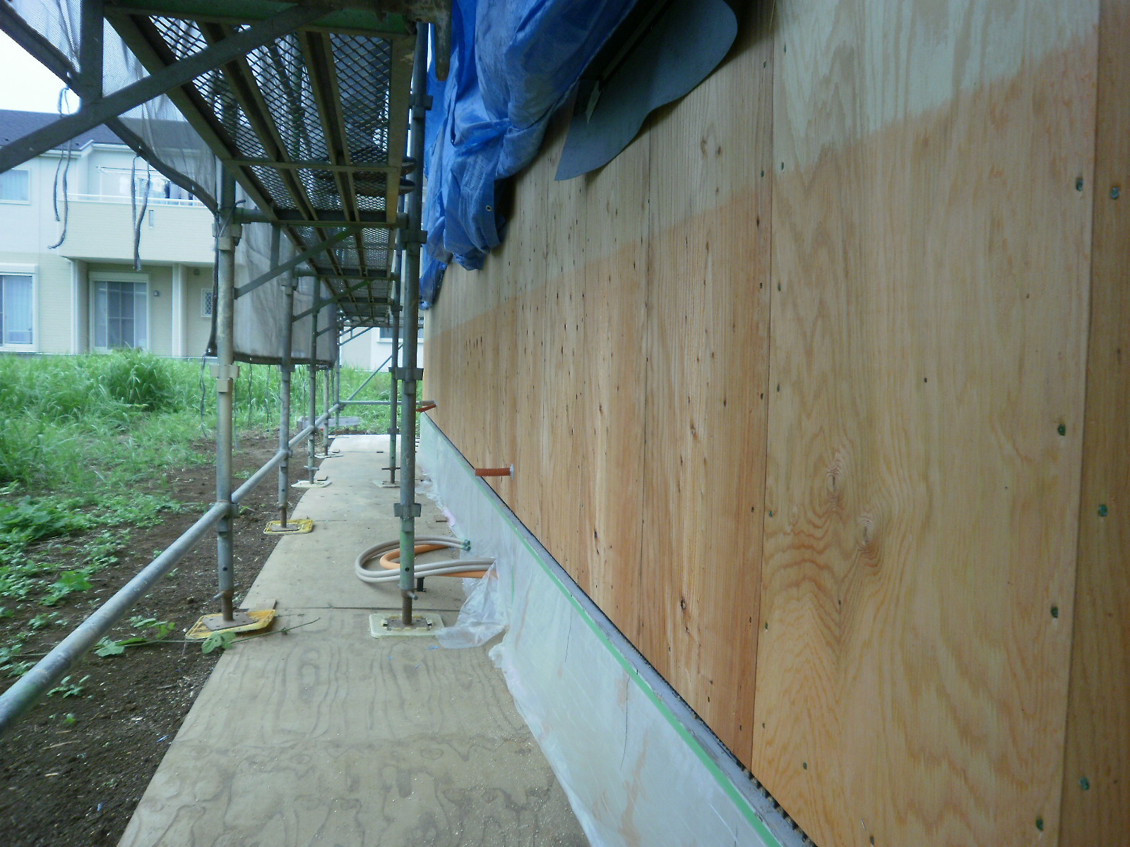 外壁下地の合板に、白アリさんの、お薬も塗りました。 |