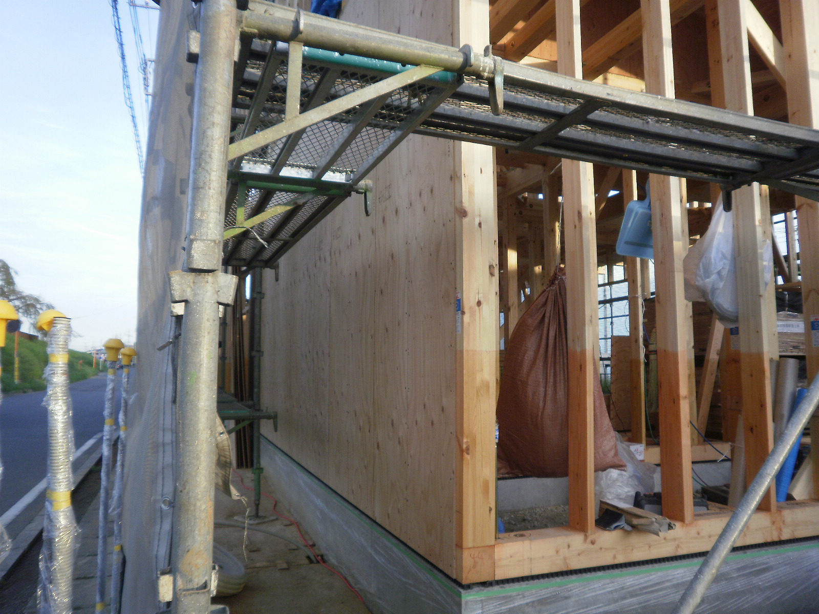 外壁面に構造用合板を貼ることにより耐力壁になるのはもちろん、壁の防水シートや断熱材の下地にもなるので必ず貼る様にしています。